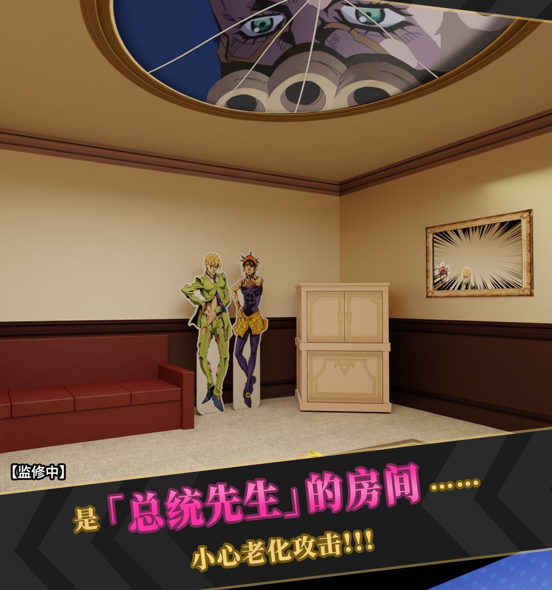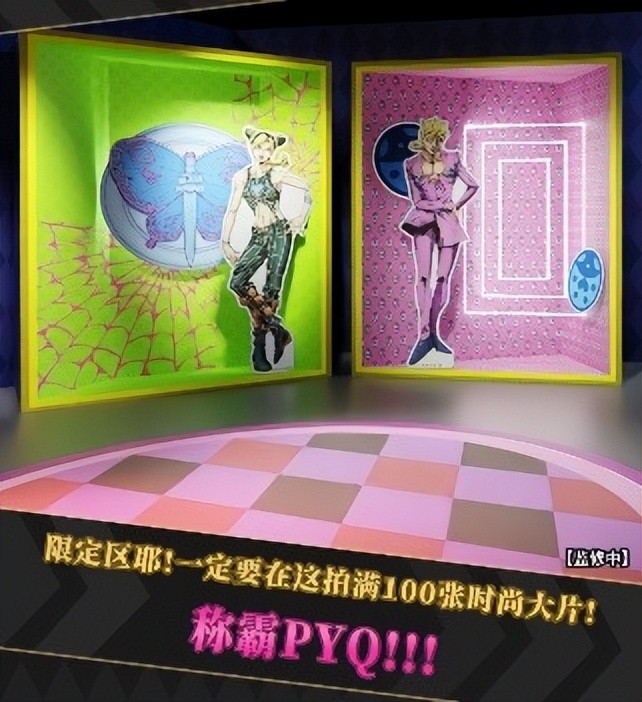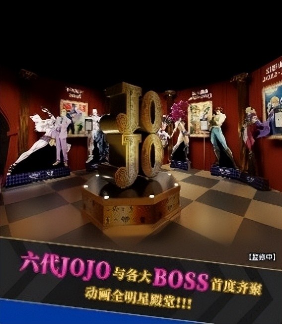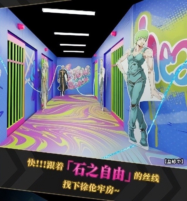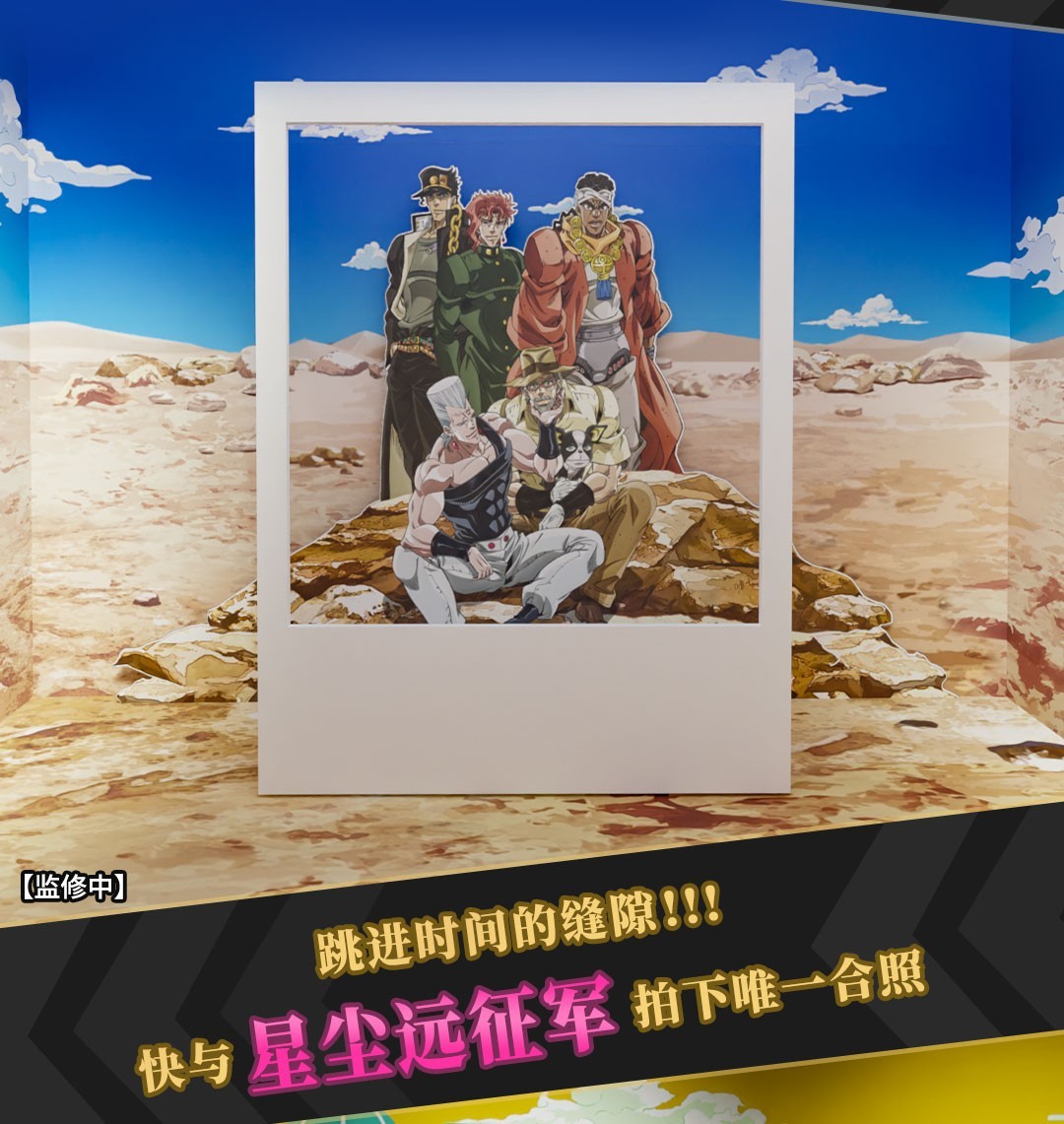 现场涵盖血脉区、启动区、重现区、冒险区、时尚奥德赛区等五大展区,重现两大对决场景:迪奥与承太郎死斗中的经典飞刀场景及“布加拉提小队”与迪亚波罗对战的名场景罗马斗兽场,还有经典的杜王町车站、帮助布加拉提小队脱逃的总统先生的房间、州立监狱水族馆中徐伦的牢房等。以篇章为连接创建多个主题板块空间,规划沉浸式互动还原体验区,展示原画与动画的复刻过程,让粉丝全方位融入JOJO的奇妙冒险世界之中。