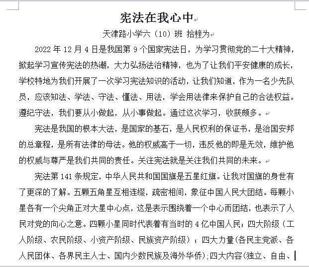 今年的12月4日是我国第9个国家宪法日,为学习贯彻党的二十大精神,掀起学习宣传宪法的热潮,大力弘扬法治精神,淮安市天津路小学大队部开展了线上宪法宣传周活动。