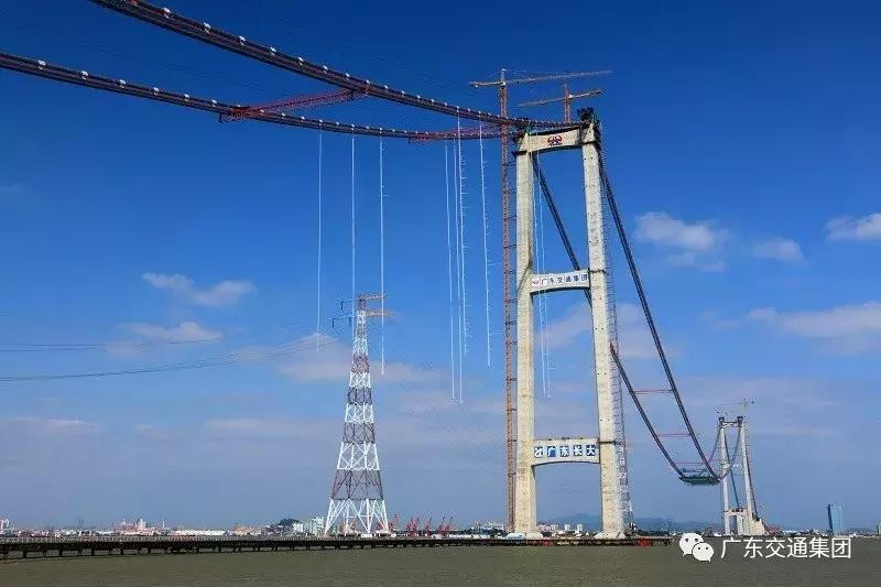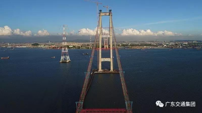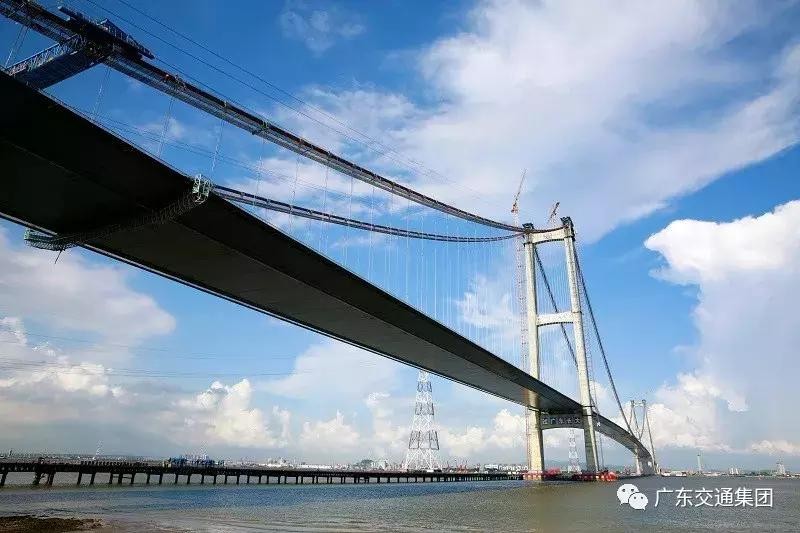 虎门二桥项目全长12.89公里,双向八车道,全线采用桥梁方案,包含两座超千米的世界级跨江特大桥,分别是主跨1200米的大沙水道桥和主跨1688米的坭洲水道桥。建成后的坭洲水道桥将成为世界第一跨度的钢箱梁悬索桥。