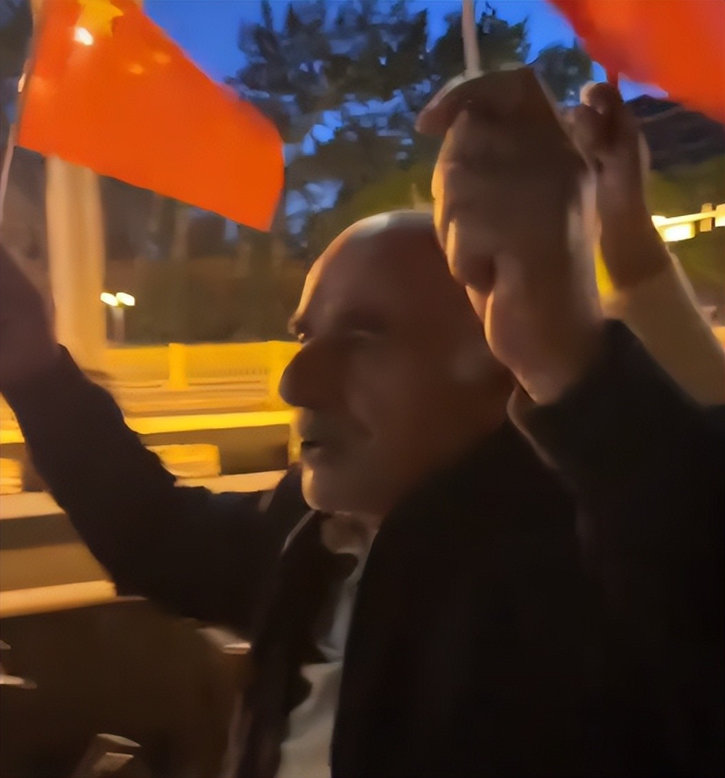 一下车,他双手拿着两面小国旗随后举了起来,嘴里还哼着歌曲,开心得像个孩子。