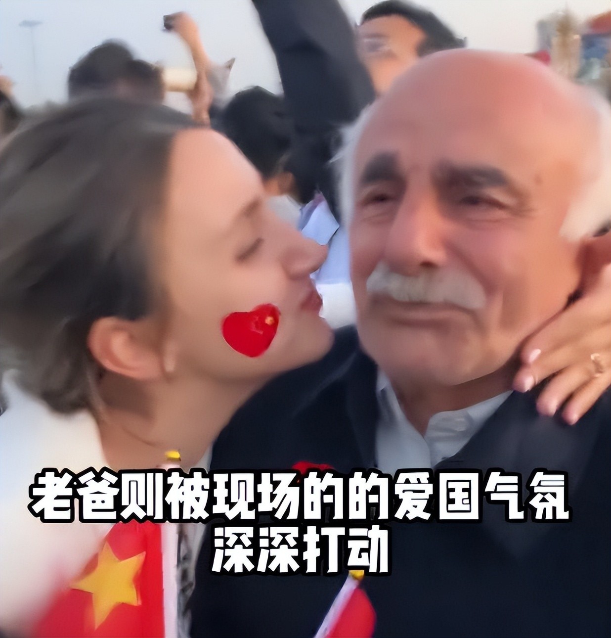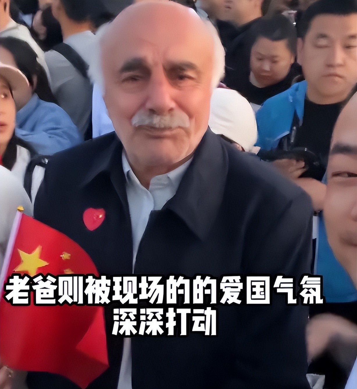 而在升旗仪式正式开始,大家都在哼唱国歌的时候,一边的老丈人哭了起来。