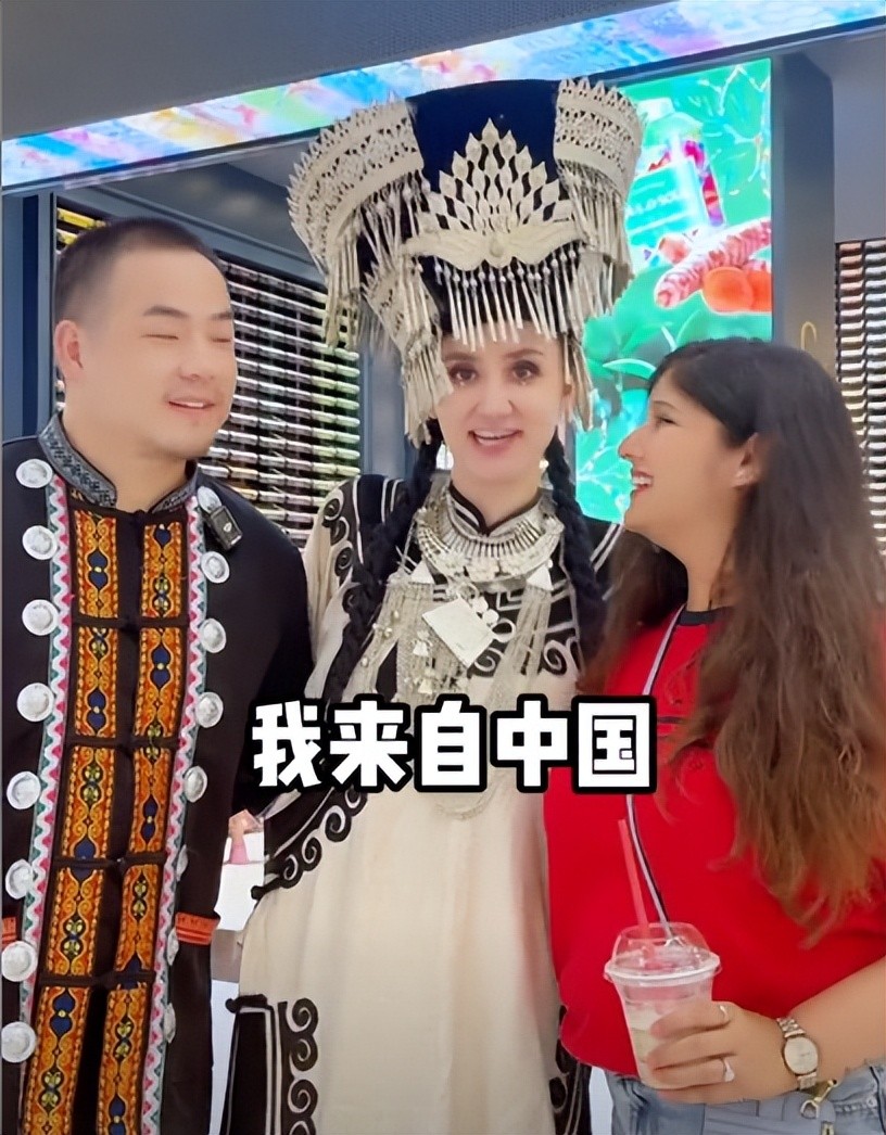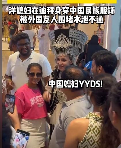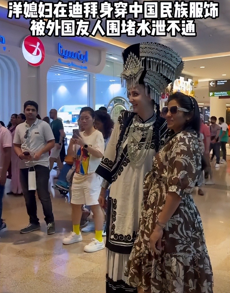 艾夏直接穿了一身彝族的传统服装,站在商场里面被很多的迪拜人围观。