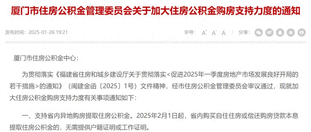 1月26日,厦门市住房公积金中心发布《关于加大住房公积金购房支持力度的通知》,自2月1日起执行。