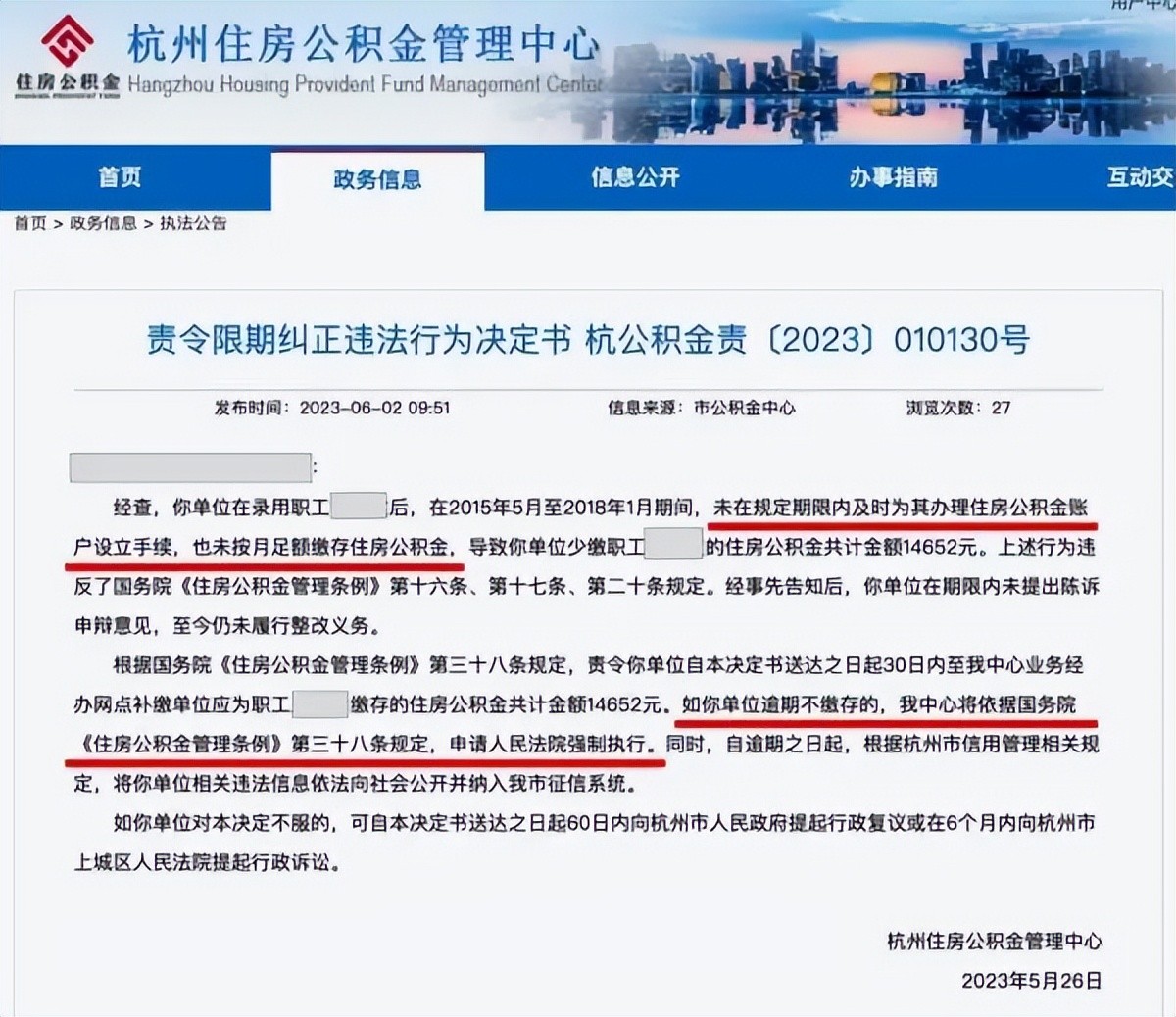 浙江杭州住房公积金管理中心官网曾公布了不少责令限期纠正违法行为决定书,要求违法单位进行补缴,并且补缴不受时效限制。