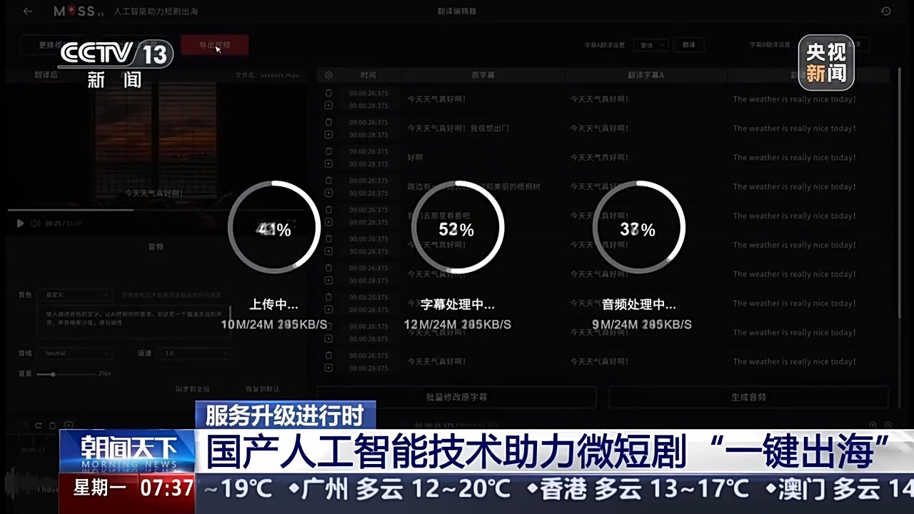 微短剧的上新速度远远跟不上海外观众的需求,特别是出口到小语种国家的译制剧翻译效率太低,从擦除字幕,到翻译成片要半个多月的时间。为了加速出海,团队在春节后用上了人工智能。