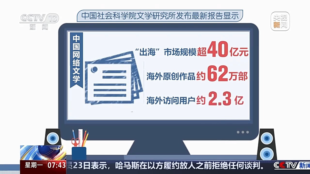 中国社会科学院文学研究所发布最新报告显示,目前,中国网络文学“出海”市场规模超40亿元,海外原创作品约62万部,海外访问用户约2.3亿。