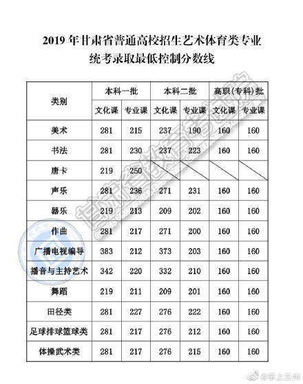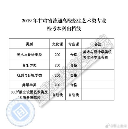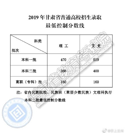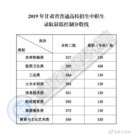 2019年甘肃省普通高校招生录取控制分数线同时公布。