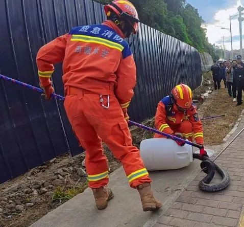 消防员差点被拖得失去平衡,只能靠另一名队员帮忙合力将蛇装进编织袋。连旁观的工作人员都捏了把冷汗。