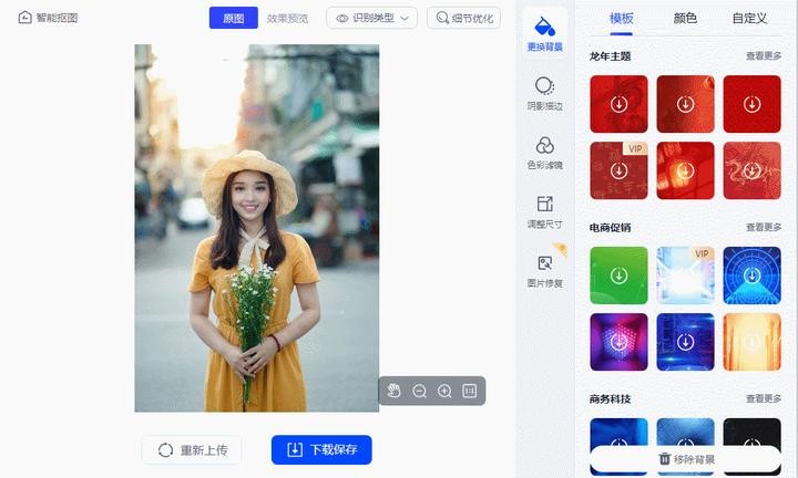 再来到右侧的编辑栏,点击“换背景”就可以更换图片背景,自定义或套用模板的都可以哦。