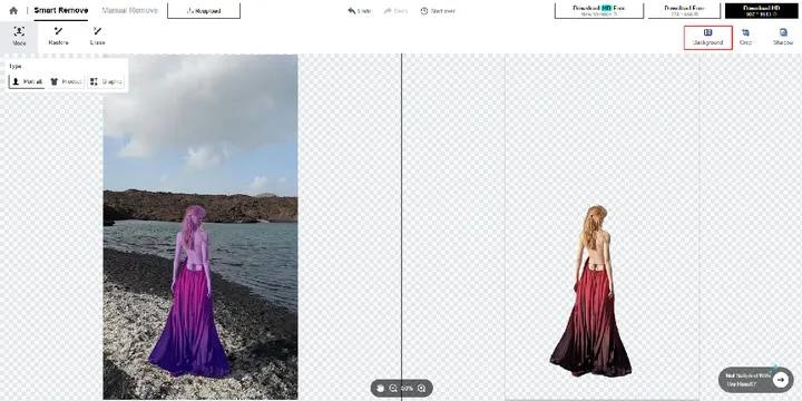 无需注册登录,直接上传图片文件,系统就会自动处理啦,左侧是没有处理的原图,右侧是抠除后的效果,直观对比非常nice,点击右上角的“背景”,还可以为图片添加更多类型的背景。