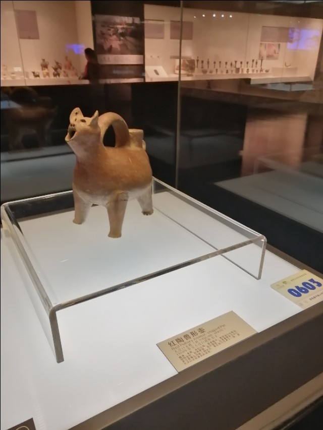 1959年山东泰安大汶口遗址出土,仿生陶器的红陶兽形器,在新石器时代发现的陶器中较为罕见,虽然是实用器,却造型生动,不失艺术情趣,是5000年前难得的一件艺术珍品,也是山东大汶口文化独特的代表。