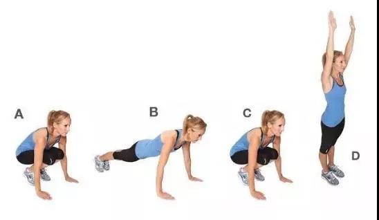 先蹲下,这个动作会用到你的臀部肌肉;然后俯身做俯卧撑,这个动作会调动你的三角肌、胸大肌;再然后双腿迅速收回完成一个腹部的收缩‘;最后双手举起尽量上跳。