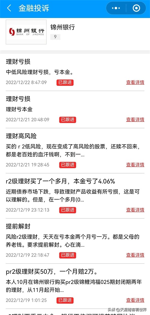 从金融投诉的小程序中我们可以看到,锦州银行被投诉也是理财亏损原因。很多老百姓把钱交给银行了,因为没有透明度,不知道自己的理财被银行投资了什么产品,这就造成了信息不对称,使老百姓难以接受。老百姓的诉求就是既然是 R 2 级产品,属于中低风险,可是为什么几个月的收益抵不住几天的亏损?