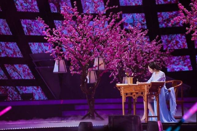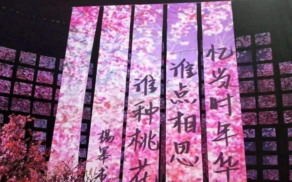 杨幂的字是写完之后,通过技术手段,投射到大屏幕上去的。此时的大屏幕,已经是桃花灼灼,香飘四溢,整个舞台上都是花瓣。再配上杨幂的字,简直是美翻天。