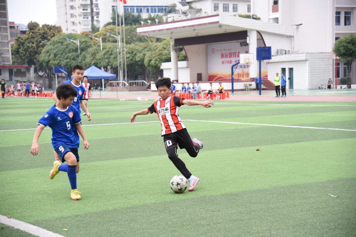 近年来南宁校园足球开展火热,青少年在球场里踢足球(资料图)