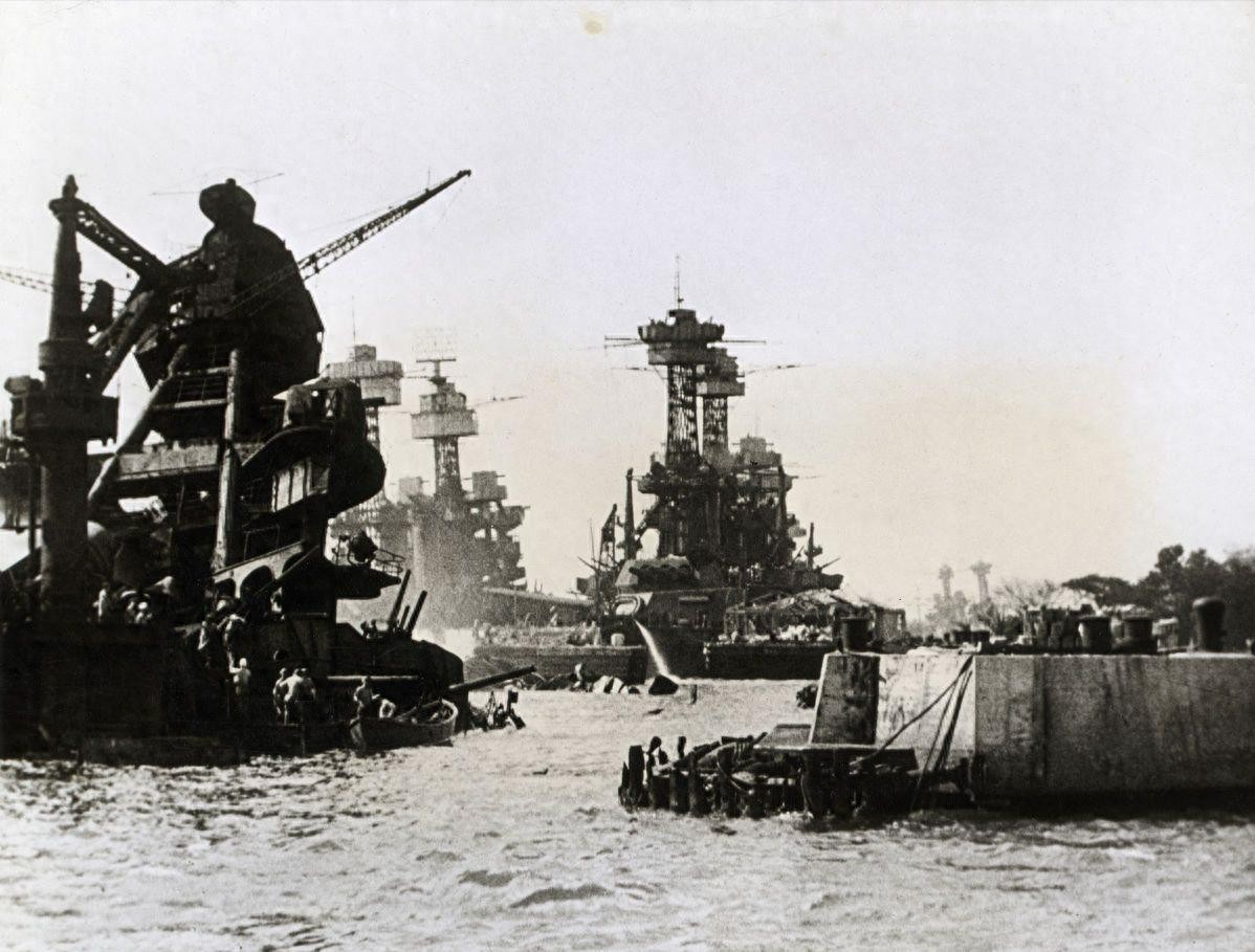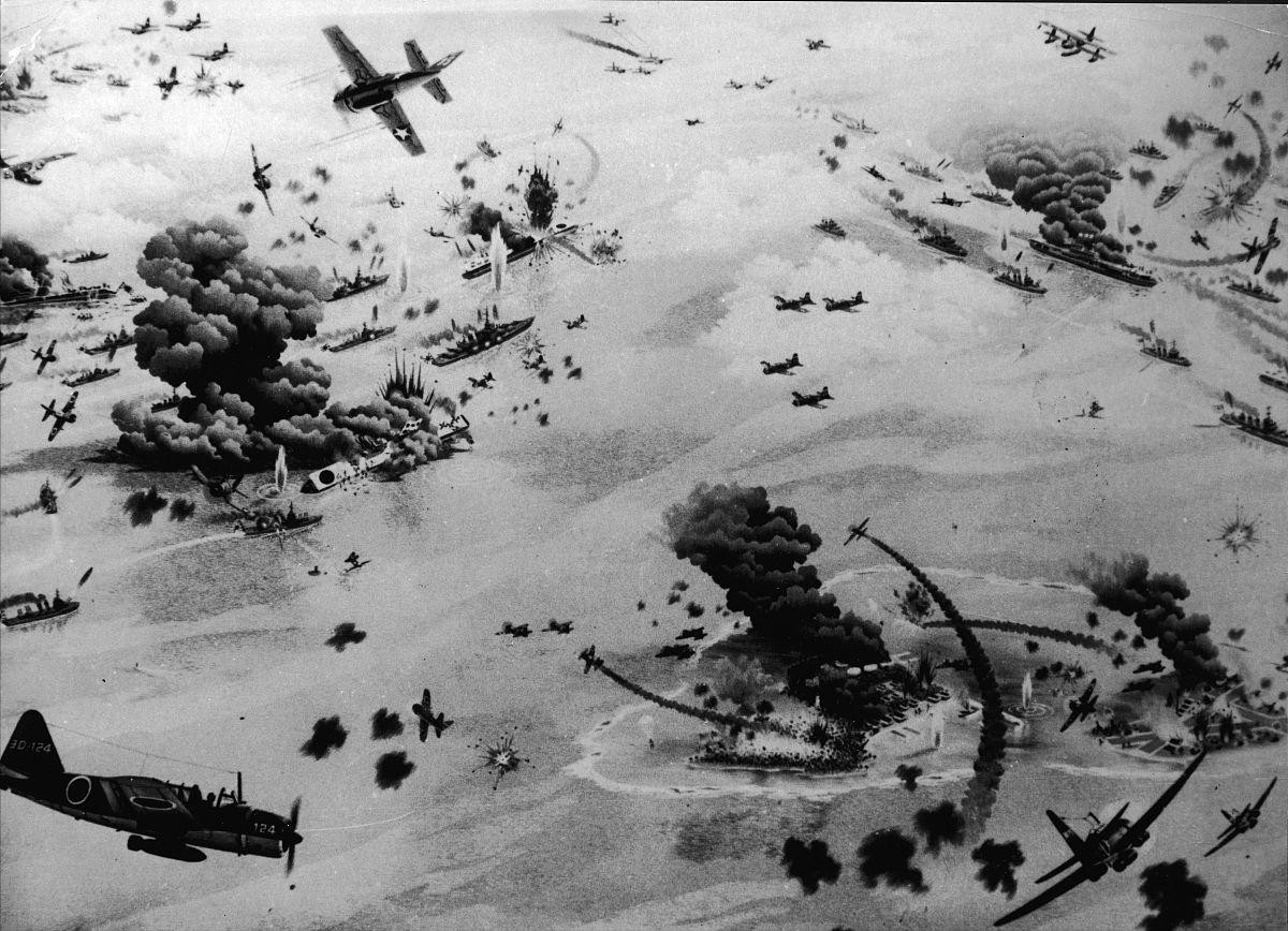 1941年12月7日,日本海军出动6艘航空母舰、350架飞机和350名潜艇,对美国夏威夷群岛的珍珠港海军基地进行突袭。在短短的两个小时内,日本空军击沉了美国太平洋舰队的8艘战舰(包括两艘战列舰)、3艘巡洋舰、4艘驱逐舰和4艘潜艇,以及摧毁了珍珠港的许多飞机和设施。此外,美军共有2400人死亡,另有1200人受伤。