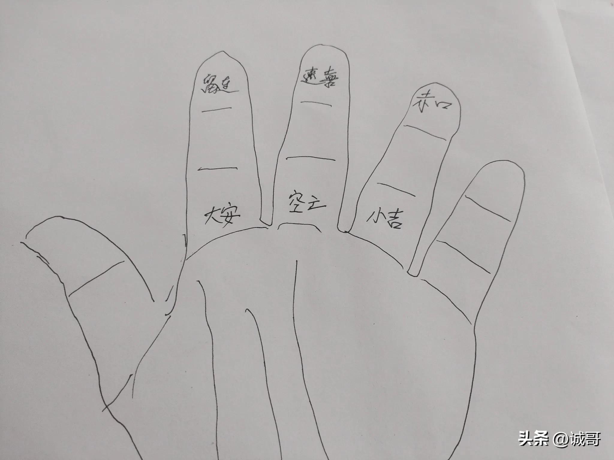 首先大家伸出你的左手,在食指下节出标上大安,在上关节处标上留连两个字,然后在中指上关节标上速喜,无名指上关节处标上赤口,无名指下关节标上小吉,然后在中指下关节处标上空亡。