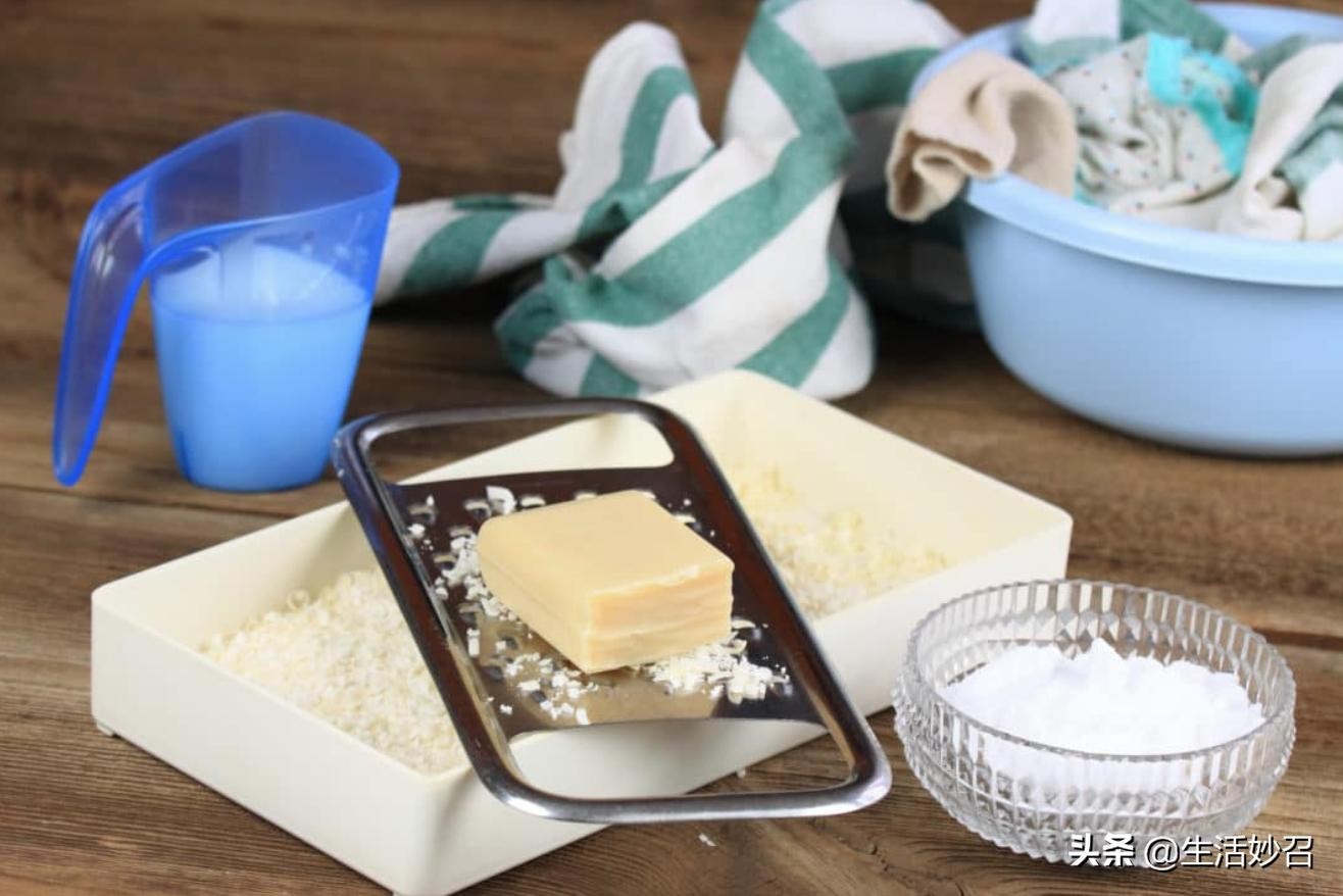 将肥皂碎用热水充分化开,放凉之后加入碱、小苏打和500毫升温水混合,最后灌入塑料桶中保存。
