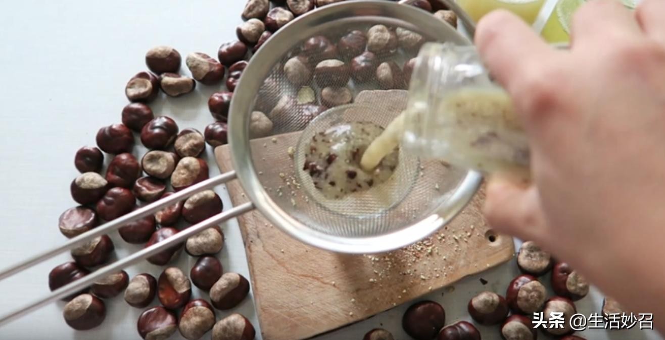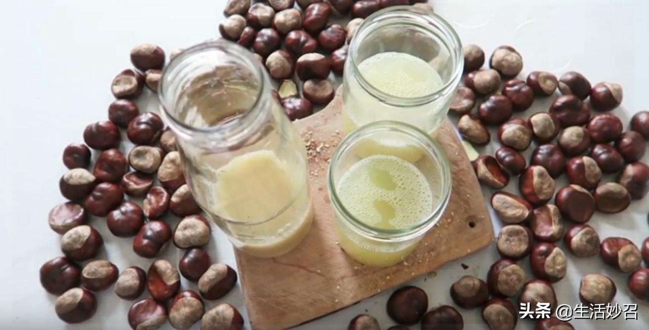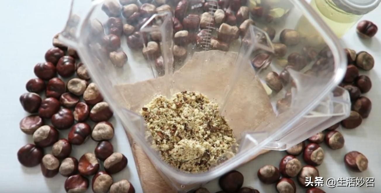 将栗子打成碎末,放入水中浸泡30分钟,液体成为奶白状,栗子和常春藤一样含有皂素。