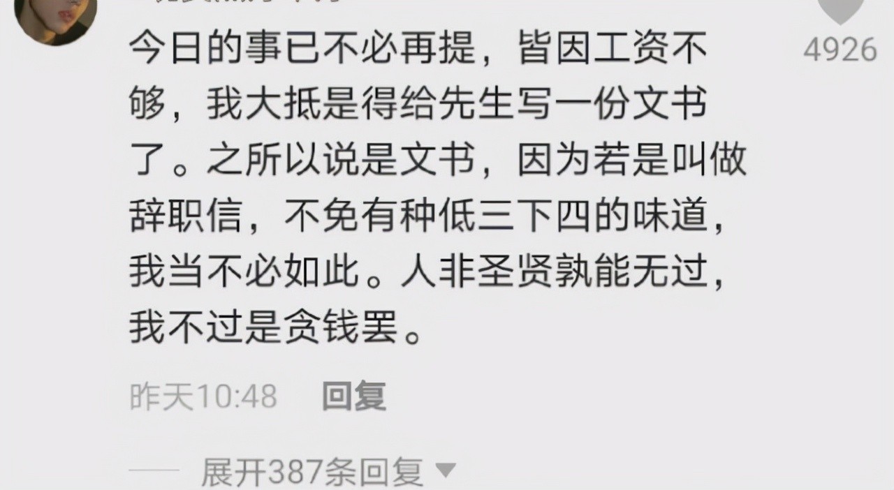 “今日的事已不必再提,皆因工资不够,我大抵是得给先生写一份文书了。之所以说是文书,因为若是叫做辞职信,不免有种低三下四的味道,我当不必如此。人非圣贤孰能无过,我不过是贪钱罢”。