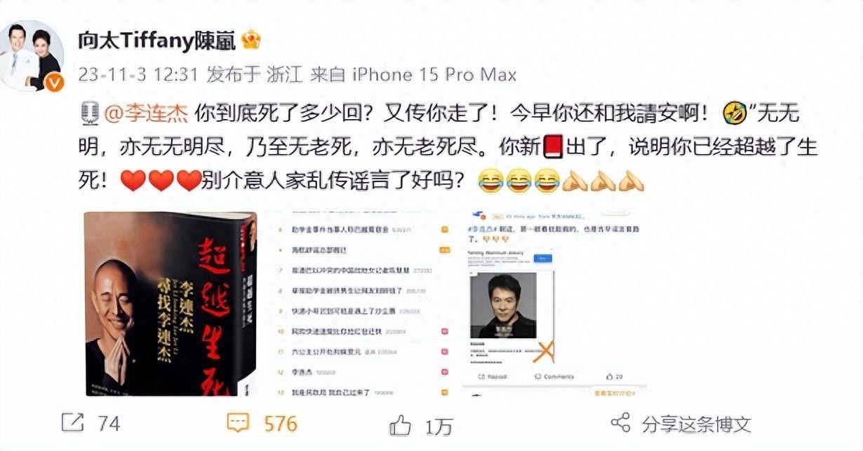 向太晒出多张截图写道:“@李连杰 你到底死了多少回?又传你走了!今早你还和我请安啊!无无明,亦无无明尽,乃至无老死,亦无老死尽。你新书出了,说明你已经超越了生死!别介意人家乱传谣言了好吗?”