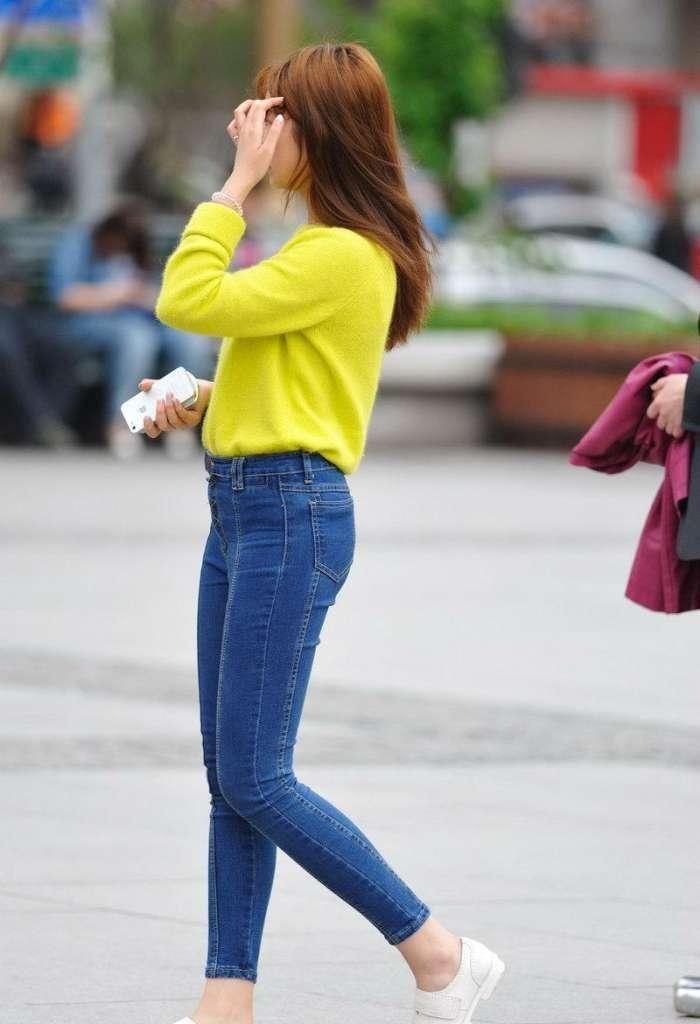 紧身牛仔裤搭配黄色上衣,让人不多看一眼都不行!