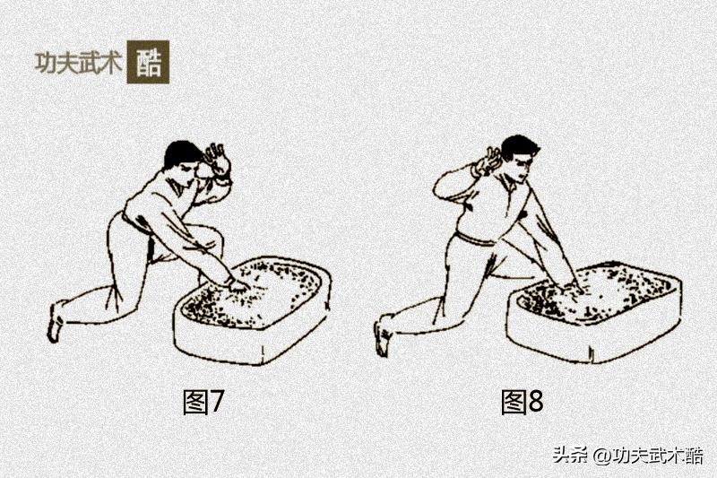 在体前放置一盆子,内盛黑豆、黄豆、绿豆等,待有一定指力后,换成河沙、铁砂,深约15-20厘米或更深。屈腿成跪步,身体前倾。先出右鹰爪,向砂堆插下,擒拿、抓扣,然后收提于右耳旁。再换左鹰爪擒拿、抓扣砂堆。每组20-50次(图7、图8)。