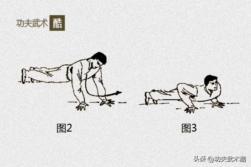 屈臂降体,使胸部向下落。贴近地面后,又向前推移挺身。同时落臀展髋,待身体前移至最大限度时,抬头撑臂,挺直身体。如是后引、下降、前移、推撑,循环练习。每组5-20次(图3)。