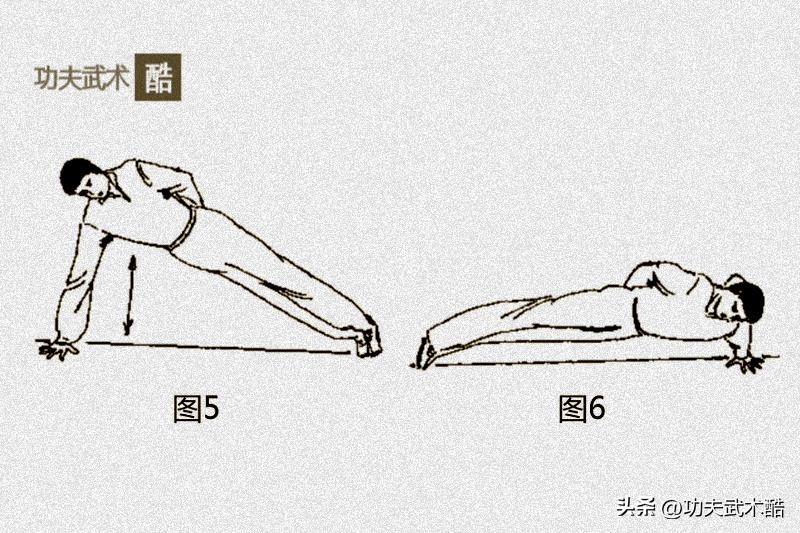 身体侧卧于地,并伸直。然后出一手扶地,五指扣地后,手指伸直,手臂由屈到伸挺,从体侧旁支撑身体,使身体及双腿始终保持侧卧并悬空。另一手背于体后(图5)。随后身体不变,支撑的手臂弯曲,五指仍扣地不变,使身体做上下运动(图6)。