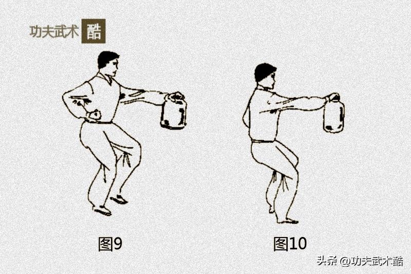 上体正直,成马步蹲立,出单手直臂伸挺,与肩平齐,再抓扣一个坛罐子边缘(罐内盛水),然后换另外一手平臂抓扣罐沿(图9、图10)。