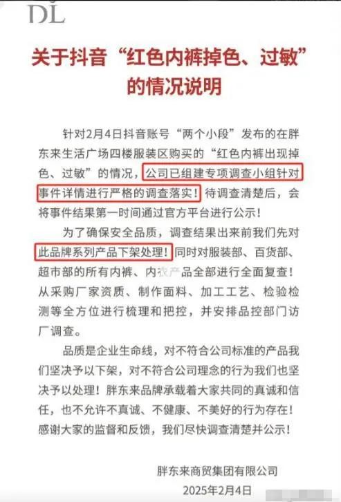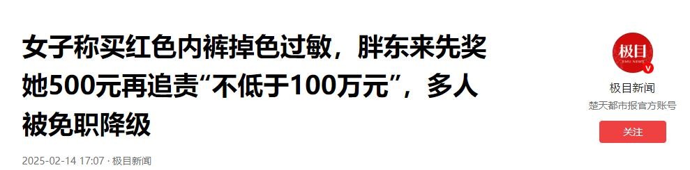 信息来源:极目新闻 2025-02-14——《女子称买红色内裤掉色过敏,胖东来先奖她500元再追责“不低于100万元”,多人被免职降级》