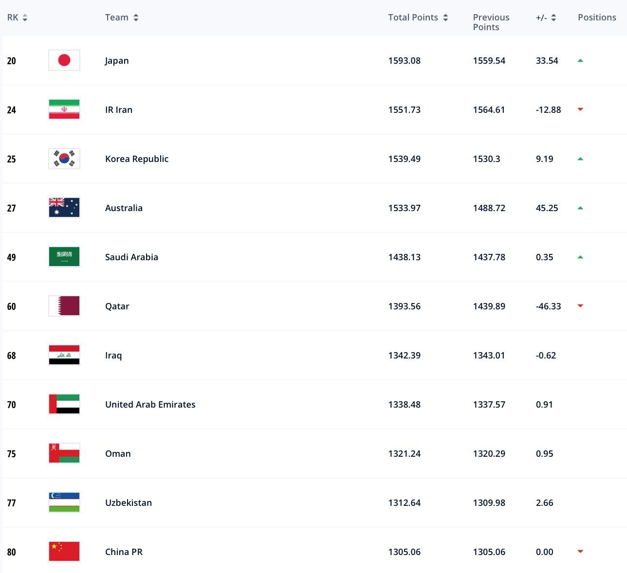 亚洲球队方面,日本凭借着世界杯的出色表现,挤掉伊朗成为亚洲第一。而国足则依旧是亚洲第11位,但世界排名从第79位掉到了第80位。