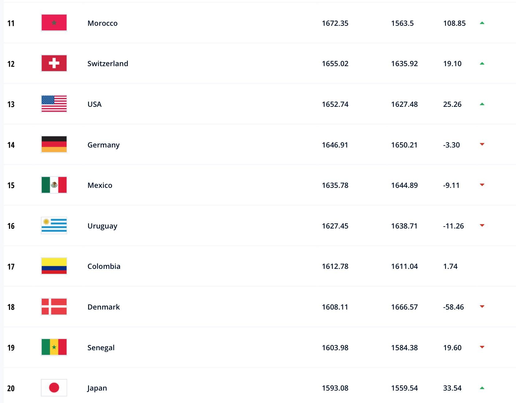 巴西虽然无缘世界杯四强,但因为之前的巨大优势,依旧排列第一。阿根廷、法国相比上期各进1位,比利时则从第2掉到了第4。摩洛哥作为世界杯黑马球队,排名也从之前的22位上升至11位。