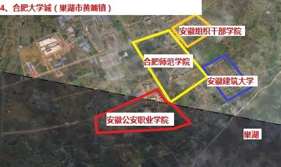 4、合肥黄麓大学城建设较晚,但是该区域临近中国五大淡水湖之一巢湖,环境优美!目前有合肥师范学院、安徽建筑大学、安徽公安职业学院等院校(如下图)