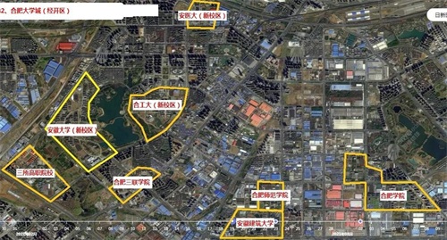 2、合肥市经开区大学城,这也是合肥市第一个大学城,这里也汇集合肥工业大学新校区、安徽大学新校区、安徽医科大学新校区、合肥师范学院、安徽建筑大学新校区、合肥学院、合肥三联学院等院校(如下图)