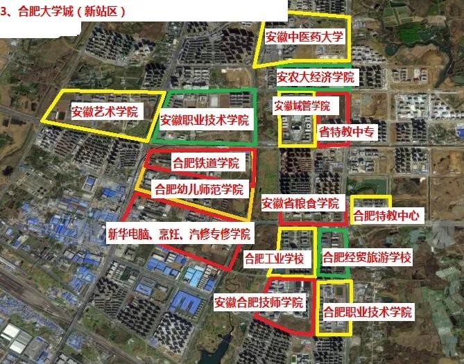 3、合肥新站高新区大学城,这里主要集中的主要是高职院校,本科院校有安徽中医药大学、安徽艺术学院以及安农大经济学院,高职院校有安徽职业技术学院、合肥职业技术学院、安徽合肥技师学院、合肥幼儿师范等高职院校(如下图)