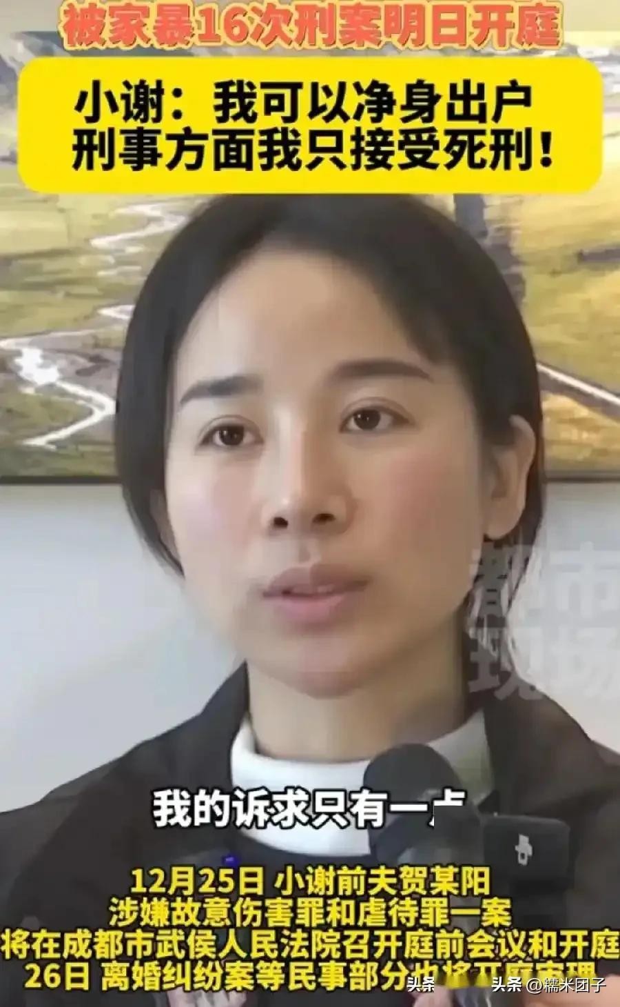 而对于谢女士提出的希望贺某阳被判死刑的请求,法院并没有支持,因为根据现行法律,只有在家暴致人死亡的情况下,才可以判处死刑,而谢女士的案件并没有造成任何人的死亡。