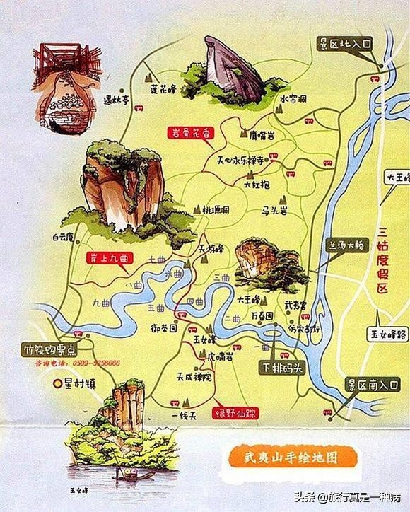 武夷山景区整体可以划分为天游---桃源洞景区;水帘洞---大红袍景区;一线天---虎啸岩景区;遇林亭---莲花峰景区;武夷宫---大王峰景区共五大景区。