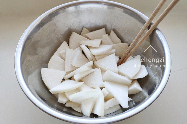 2、萝卜用刮皮刀刮去外皮,对半切开后再切成厚片,放入盆中加2小勺盐搅拌均匀,先腌制1个小时。