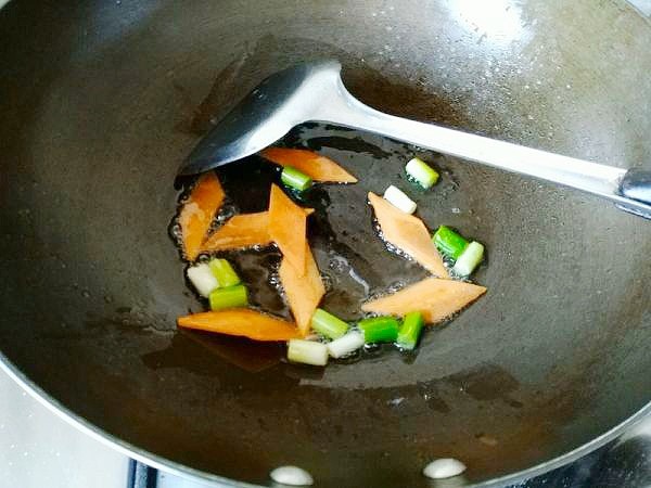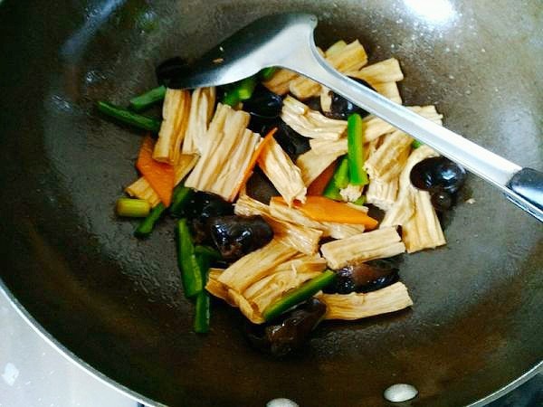 3.炒锅烧热放入适量的食用油,油热后放入葱姜爆炒出香味,然后放入胡萝卜炒软,放入生抽半勺,放入腐竹,老抽一勺调色。