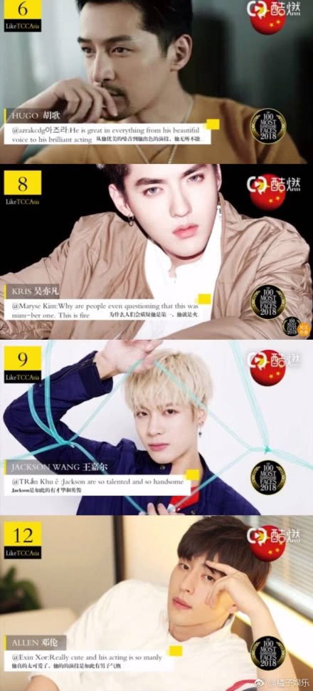 而近日,有媒体曝出亚太地区最帅的一百张面孔曝光,其中不仅吴亦凡王嘉尔上榜,这也没有出乎大家网友的意料。毕竟无论是吴亦凡还是王嘉尔,他们的颜值的确是没得黑,并且关于这种的榜单,他们也上过许多次,所以他们上榜一点也不出乎网友的意料。吴亦凡在这名榜单排名第八,王嘉尔排名第九,而在国内除了他们两个,还真有不少明星上榜,起义中易祥千玺排名第十三,如今的稚嫩少年也变成了型男,上榜也是情理之中,而张艺兴也上榜,排名第十五,王凯排名第十七,林更新排名第十九。
