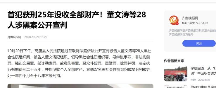 齐鲁网报网《首犯获刑25年没收全部财产!董文涛等28人涉黑案公开宣判》