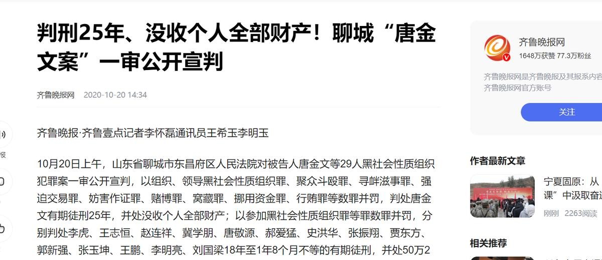 齐鲁晚报网《判刑25年、没收个人全部财产!聊城“唐金文案”一审公开宣判》