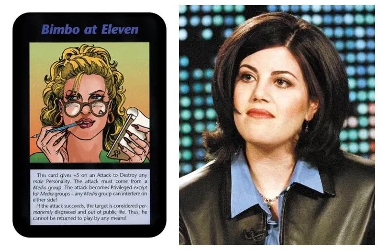 左边这张卡牌是一张美人计卡牌,可以看到卡牌卡图和“拉链门”(既克林顿性丑闻)的女主角莱温斯基有那么几分的相似,可能有些人看不出来,我们试着把卡图中的眼镜、笔去除,在脑子里想一下,是不是会有感觉了?是不是脸型、嘴巴、眉毛、眼睛都很像!美人计这张卡牌所“预言”也就不言而喻了。