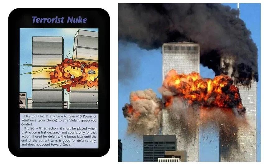 大楼的样式、撞击的位置、爆炸引起的火焰方向,几乎是一摸一样的。要知道左边的卡牌是发行于1995年,而911事件则是发生在2001年,而唯一不同点在于卡牌图片左下角裙楼上有一个光明会标志(金字塔内嵌全视之眼),导致有不少阴谋论者认为这一切的事件是由光明会策划的,不过理性分析,我觉得只是单纯的卡牌为了贴合《光明会:新世界秩序》这个名字而已。