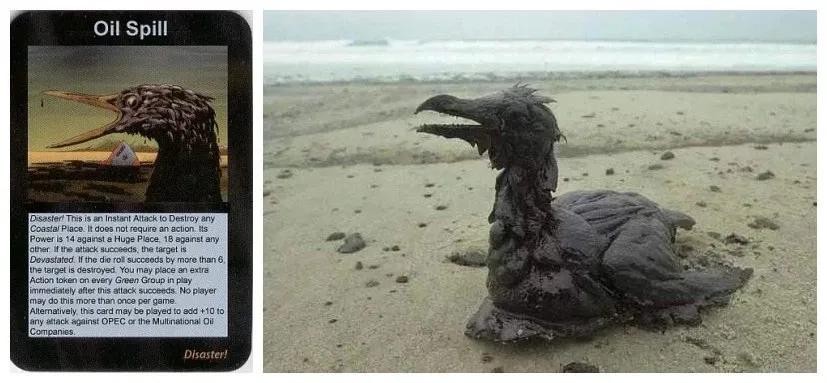 左边卡牌跟右边的墨西哥湾漏油事件发生后的真实照片,可以说是一摸一样,而卡牌发行于1995年,看完令人不禁毛骨悚然。