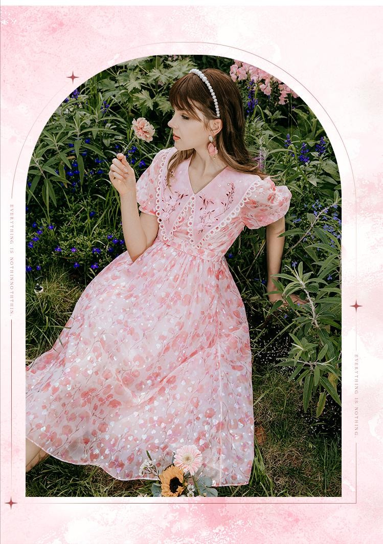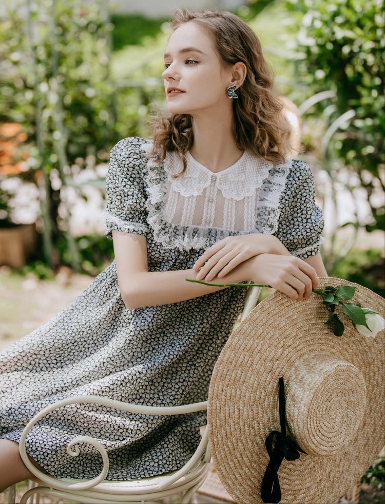 推荐:蕾丝钩花娃娃领 清新碎花图案 收腰A字裙型