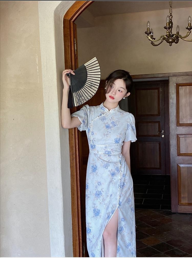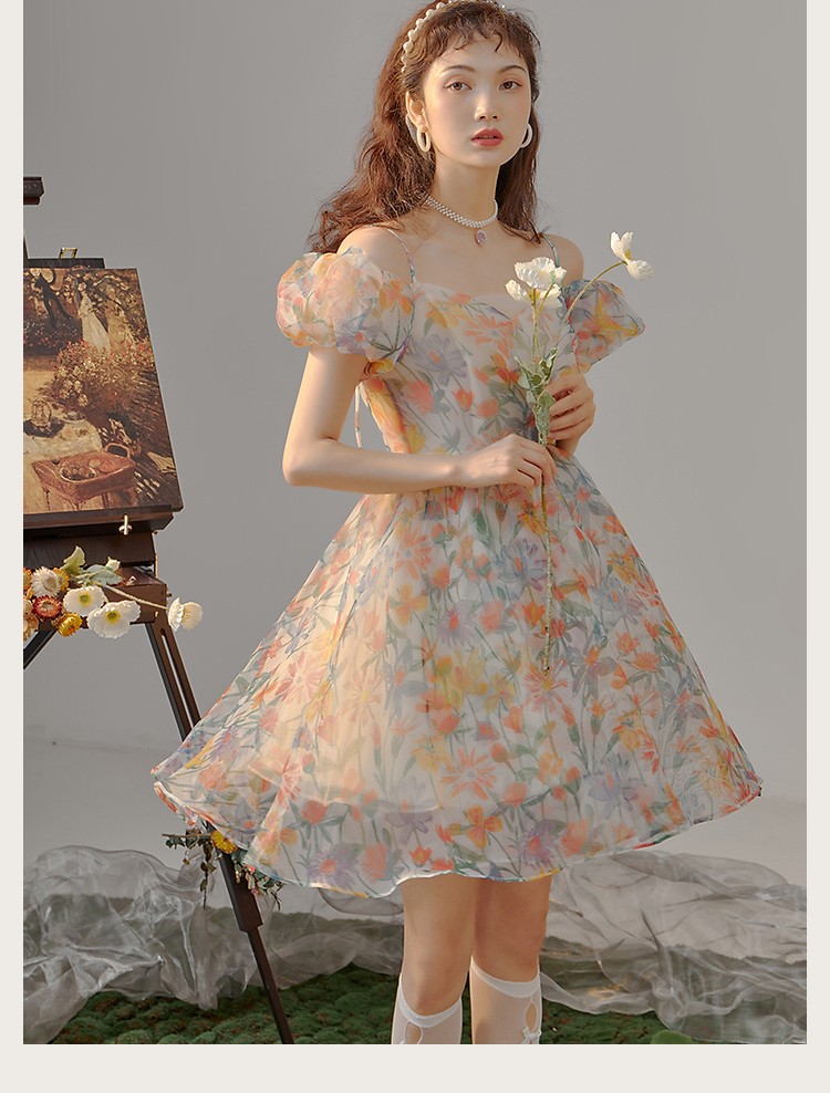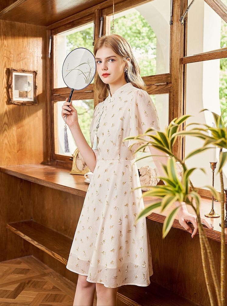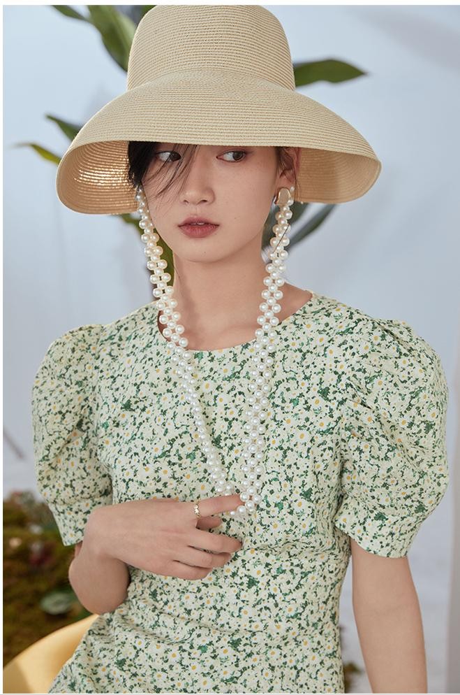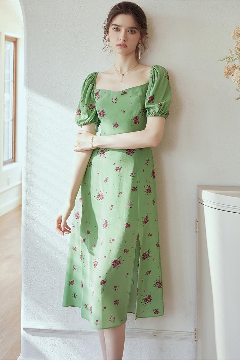 推荐:优雅鱼尾裙摆 碎花图案 泡泡袖 亲肤面料