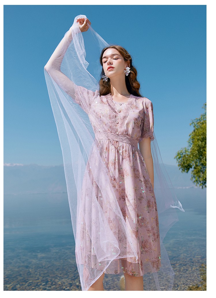 推荐:气质方领领型 收腰荷叶边裙摆 清新印花