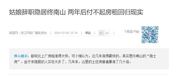 浙江网络广播电视台2018-12-28发布的关于《姑娘辞职隐居终南山 两年后付不起房租回归现实》的报道;